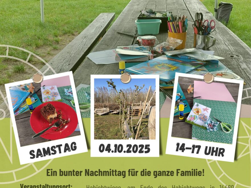 Im Oktober gibt es noch einmal ein Wiesencafe auf der Habichtwiese. Am Samstag den 4. 10. gibt es von 14 – 17 Uhr einen bunten Nachmittag für die ganze Familie. Auf der Habichtwiese in Bornstedt sind wir für Euch da und wollen Basteln, Spielen und Austauschen bei Kaffee und Kuchen.