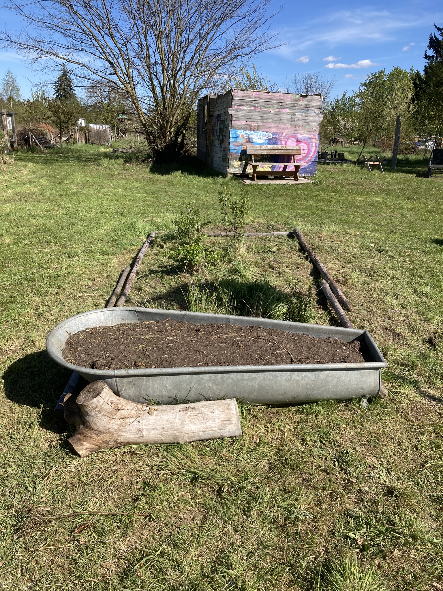 Das Stachelbeerenbeet haben wir freigelegt und eine alte Zinkwanne zum bepflanzen vorbereitet. Nebendran gibt es ein neues Wurfspiel zum ausprobieren.
